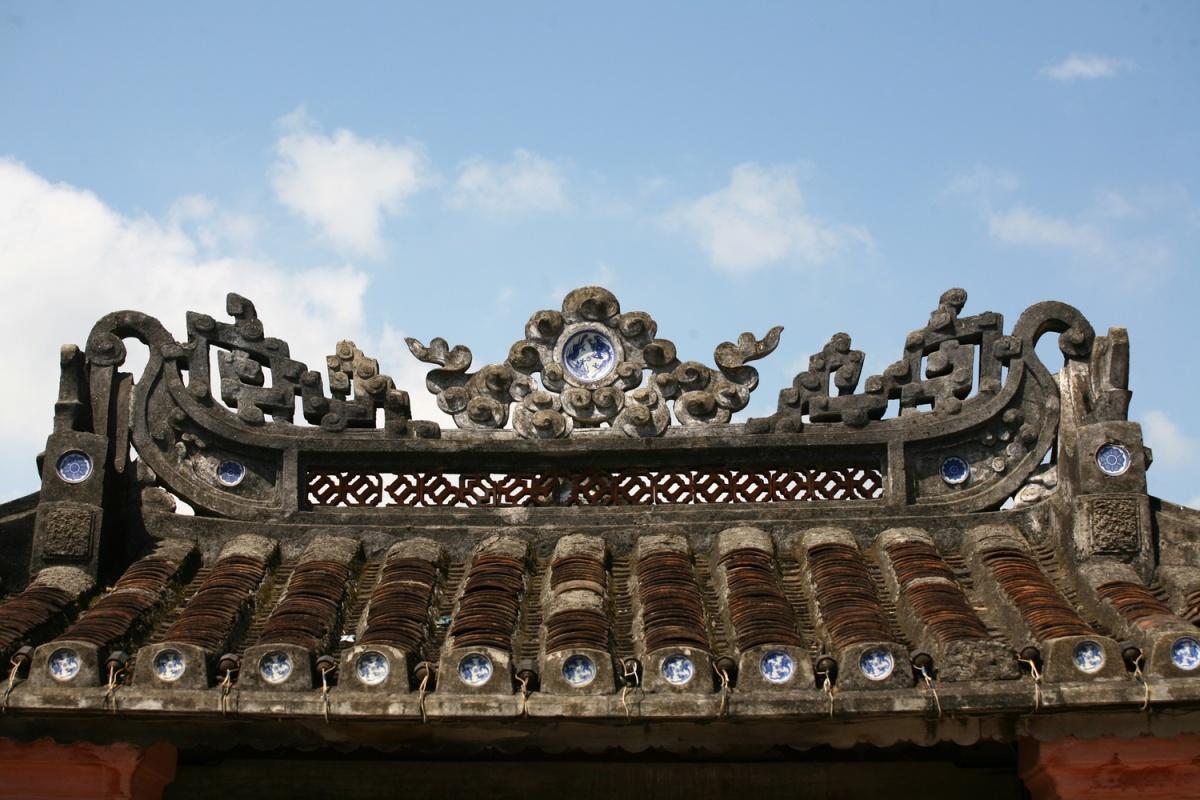 Mái công trình lợp ngói âm dương, với những chi tiết trang trí tinh xảo trên bờ nóc, bờ chảy. Đặc biệt là có những đồ gốm men lam được khảm trên mái.